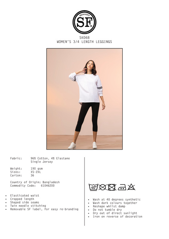 Mix-up your workout with these ¾ length leggings. Elasticated waist and shaped side seams. A great fashion staple and ideally suited for body and mind customers.¾ length leggings with elasticated waist and twin-needle stitching at hemRemovable Skinnifit labelSEDEX certifiedOeko-Tex certifiedBSCI certifiedVegan certified.Accreditations: Amfori BSCI|Oeko-Tex|Sedex|Peta Approved VeganAge Group: AdultFabric: 96% Cotton, 4% Elastane single JerseyGender: FemalePlus Size: NoProduct Type: LeggingsSize Range: XS to 2XLSizing To Fit: XS 8 S 10 M 12 L 14 XL 16 2XL 18Tag: Tear-outWashing Instructions: Do not bleach. Do not tumble dry. 2 dot iron. Do not dry clean. Wash at 40 degrees synthetic. Wash dark colours together. Re-shape whilst damp. Dry out of direct sunlight. Iron on reverse of decorationWeight (GSM): 190gsm]]>