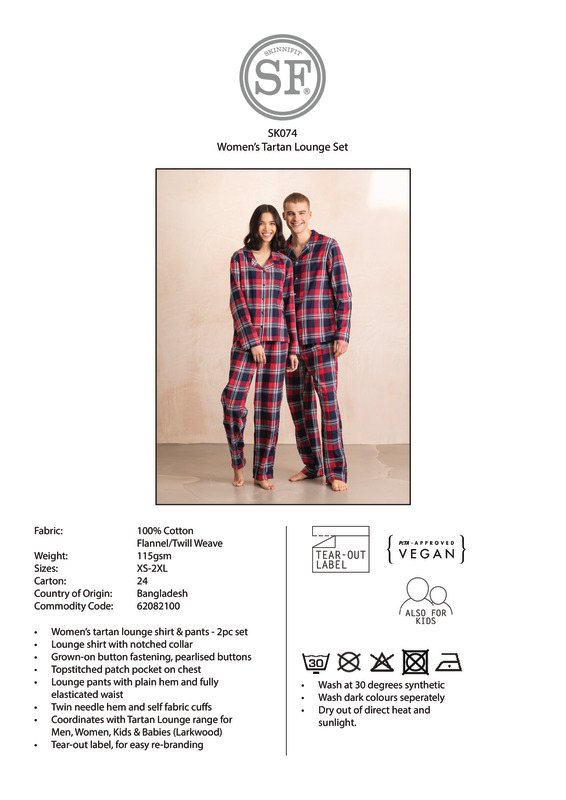 Chill out with SF’s trendy loungewear, perfect for family and friends twinning. Tear-out label for easy rebranding.Woven tartan lounge set with plain hemShirt with a pyjama collar and pearlised button front, and bottoms with a full elasticated waistTear-out labelVegan certified.Accreditations: Amfori BSCI|Peta Approved VeganAge Group: AdultFabric: 100% Cotton flannel weaveGender: FemalePlus Size: NoProduct Type: PyjamasSize Range: XS to 2XLSizing To Fit: XS 28/30″ S 30/32″ M 32/34″ L 34/36″ XL 36/38″ 2XL 38/40″Tag: Tear-outWashing Instructions: Wash at 30 degrees synthetic. Do not tumble dry. Do not bleach. Do not dry clean. Iron on low. Wash dark colours separately. Dry out of direct heat and sunlight.Weight (GSM): 115gsm]]>