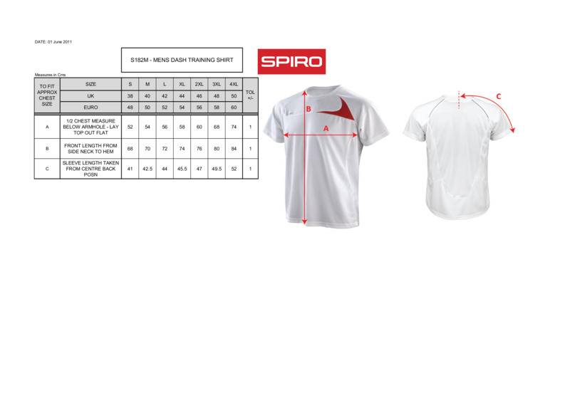 Lightweight training t-shirt with moisture wicking control. Technically designed to work as hard as you!COOL-DRY® performance fabric with added moisture fast wicking control, keeps skin cool and comfortableLightweightContour fit panels with reflective pipingSophisticated technologySoft athletic COOL-DRY® fabricQuick dryingUltra reflecting Spiro print logoIdeal layer garmentBreathableExtremely lightweight.Decoration Guidelines:Decorating methods: Embroidery & Transfer printDecorators access point: OpenOeko-Tex certified.Accreditations: Oeko-TexAge Group: AdultFabric: 100% Polyester. 140gsm Jacquard meshGender: MalePlus Size: YesProduct Type: T-ShirtsSize Range: S to 4XLSizing To Fit: S 38″ M 40″ L 42″ XL 44″ 2XL 46″ 3XL 48″ 4XL 50″Tag: Sewn TagWashing Instructions: 40 degrees. Do not bleach. Iron on medium heat. No dry clean. No tumble dryWeight (GSM): 140gsm]]>
