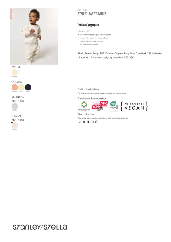The modernised baby Tumbler jogger pants – with a new fit and improved details, they’re the perfect fit for little ones.The iconic baby jogger pantsMedium fitSelf-fabric, elasticated, grown-on waistbandNarrow twin-needle at waistband baseNo side seam for extra comfort1x1 rib at bottom leg cuff.Accreditations: Fair Wear Foundation|GOTS (Licence)|Oeko-Tex Standard 100|Peta Approved VeganAge Group: InfantFabric: 85% Organic ringspun combed cotton terry,