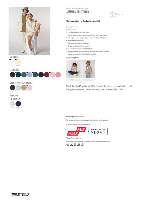 The unisex iconic zip-through hooded sweatshirts in 350gsm brushed fleece. Crafted from premium 85% organic cotton, and 15% recycled polyester. Featuring premium matt silver trims and zip, with clean herringbone internal tape finishing at zip, double fabric hood lining, and twin-needle top stitching.Set-in sleeveDouble-layered hood in self-fabricRound drawcords in matching body colour with metal tippingHerringbone tape at inside back neck and at inside of zipperMetal zipper and eyeletsSelf-fabric half-moon at back neckSingle-needle topstitch at neckline1x1 rib at sleeve hem and bottom hem Armhole, sleeve hem and bottom hem with twin-needle topstitchKangaroo pocket with wide double topstitchUnisex, medium fit, long sleeve, round-neck with hood85% organic ringspun combed cotton, 15% recycled polyesterBrushed sweatshirtFabric washed, light sueded.Accreditations: Fair Wear Foundation|Oeko-Tex Standard 100|Peta Approved VeganAge Group: AdultFabric: 85% Organic ringspun combed cotton, 15% Recycled polyesterGender: UnisexPlus Size: NoProduct Type: HoodiesSize Range: XXS to 3XLSizing To Fit: XXS 32/34″ XS 34/36″ S 36/38″ M 38/40″ L 41/43″ XL 43/45″ 2XL 46/47″ 3XL 48/50″Tag: Tear-outWashing Instructions: Wash at 30°. Bleaching no. Ironing 110°. Do not tumble dry. Do not dry clean.Weight (GSM): 350gsm]]>