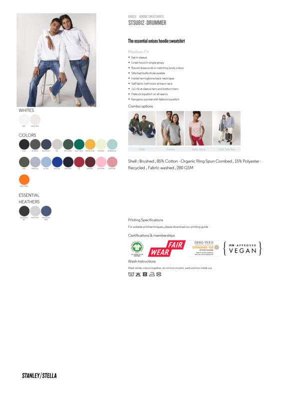 The unisex hoodie sweatshirt from the Essentials Collection. This 280gsm brushed sweatshirt has set-in sleeves, kangaroo pocket, single Jersey hood lining and a clean knotted finish drawstring.Set-in sleeveLined hood in single JerseyRound drawcords in matching body colourStitched buttonhole eyeletsInside herringbone back neck tapeSelf-fabric half moon at back neck1x1 rib at sleeve hem and bottom hemFlatlock topstitch on all seamsKangaroo pocket with flatlock topstitch.Accreditations: Fair Wear Foundation|Oeko-Tex Standard 100|Peta Approved VeganAge Group: AdultFabric: 85% Organic ringspun combed cotton, 15% Recycled polyesterGender: UnisexPlus Size: NoProduct Type: HoodiesSize Exclusions: *4XL only available in these colours. †5XL only available in these coloursSize Range: XXS to 5XLSizing To Fit: XXS 32/34″ XS 34/36″ S 36/38″ M 38/40″ L 41/43″ XL 43/45″ 2XL 46/47″ 3XL 48/50″ 4XL* 51/54″ 5XL† 55/58″Tag: Tear-outWashing Instructions: Washing: 30°. Bleaching no. Ironing 110°. Do not tumble dry. Do not dry clean.Weight (GSM): 280gsm]]>