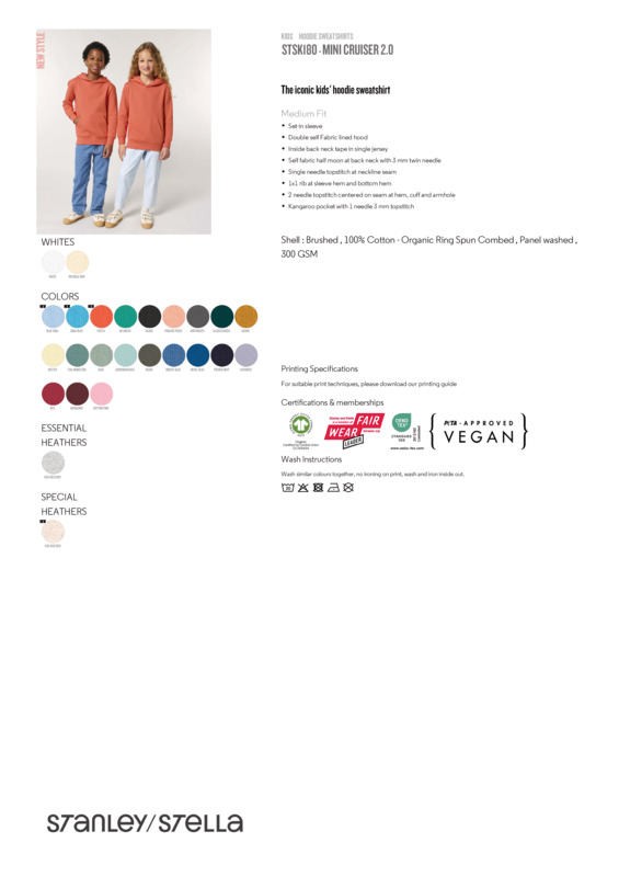 The modernised kids Mini Cruiser 2.0 iconic hoodie sweatshirt – now in 100% organic cotton, with a new modern medium fit and wider rib at the hem and sleeve cuffs. It also offers better decoration results than before, plus a deep and vibrant colour palette to choose from which is aligned with the Cruiser 2.0 for that total family look.The iconic kids’ hoodie sweatshirtMedium fitDouble self-fabric lined hoodSingle-needle topstitch at neckline seam1x1 rib at sleeve hem and bottom hemTwin-needle topstitch centered on seam at hem, cuff and armhole.Accreditations: Fair Wear Foundation|GOTS (Licence)|Oeko-Tex Standard 100|Peta Approved VeganAge Group: KidsFabric: 100% Organic ringspun combed cotton brushedGender: UnisexPlus Size: NoProduct Type: HoodiesSize Range: 3/4–12/13Sizing To Fit: 3/4 5/6 7/8 9/11 12/13Tag: Tear-outWashing Instructions: Machine wash, 30?C. Wash similar colours together. No ironing on print. Wash and iron inside out. Do not tumble dry.Weight (GSM): 300gsm]]>