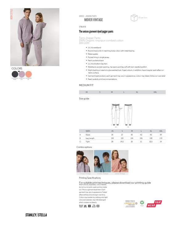 Vintage continues to be a key trend. Following the Creator vintages, this unique dying technique has been applied to the Mover unisex dyed jogger pants.1x1 rib waistband and leg openingRound drawcords in matching body colour with metal tipping and metal eyeletsPocket lining in single JerseyPatch pocket at backTerry fabric, 300gsmThis product has an aged garment dye which gives vintage look on the seems and fabric surfaceEach garment may vary in appearanceColours might bleed, please follow our care label.Accreditations: Fair Wear Foundation|Oeko-Tex Standard 100|Peta Approved VeganAge Group: AdultFabric: 100% Organic ringspun combed cottonGender: UnisexPlus Size: NoProduct Type: SweatpantsSize Exclusions: *3XL only available in these coloursSize Range: XS to 3XLSizing To Fit: XS 29/30″ S 31/32″ M 33/34″ L 35/37″ XL 38/39″ 2XL 40/41″ 3XL* 42/43″Tag: Tear-outWashing Instructions: Washing: 30°. Bleaching no. Ironing 110°. Do not tumble dry. Do not dry clean.Weight (GSM): 300gsm]]>