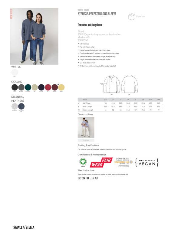 This unisex long sleeve polo, with a comfortable boxy fit and finished in refined detailing, is the perfect item to be in style for any occasion.Set-in sleeveFlat knit rib on collarInside heavy single Jersey back neck tapeFront placket with 2 buttons in matching body colourSlit at side seams with heavy single Jersey facingSingle needle topstitch at shoulder seams1x1 rib at sleeve hemBottom hem with narrow double needle topstitch.Accreditations: Fair Wear Foundation|GOTS (Licence)|Oeko-Tex Standard 100|Peta Approved VeganAge Group: AdultFabric: 100% Organic ringspun combed cottonGender: UnisexPlus Size: YesProduct Type: PolosSize Range: XXS to 3XLSizing To Fit: XXS 32/34″ XS 34/36″ S 36/38″ M 38/40″ L 41/43″ XL 43/45″ 2XL 46/47″ 3XL 48/50″Tag: Tear-outWashing Instructions: Do not tumble dry. Washing: 30° gentle. Do not bleach. Ironing: 110°Weight (GSM): 230gsm]]>
