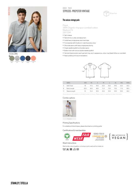 This vintage unisex short sleeve polo, with a comfortable boxy fit and finished in refined detailing, is the perfect item to be in style for any occasion.Set-in sleeveFlat knit rib on collar and sleeve hemInside heavy single Jersey back neck tapeFront placket with 2 buttons in matching body colourSlit at side seams with heavy single Jersey facingSingle needle topstitch at shoulder seamsBottom hem with narrow double needle topstitchGarment-dyed product – each garment may vary in appearance, colour may bleed, follow our care labelRead carefully the print recommendations.Accreditations: Fair Wear Foundation|GOTS (Licence)|Oeko-Tex Standard 100|Peta Approved VeganAge Group: AdultFabric: 100% Organic ringspun combed cottonGender: UnisexPlus Size: YesProduct Type: PolosSize Range: XXS to 3XLSizing To Fit: XXS 32/34″ XS 34/36″ S 36/38″ M 38/40″ L 41/43″ XL 43/45″ 2XL 46/47″ 3XL 48/50″Tag: Tear-outWashing Instructions: Do not tumble dry. Washing: 30° gentle. Do not bleach. Ironing: 110°Weight (GSM): 230gsm]]>