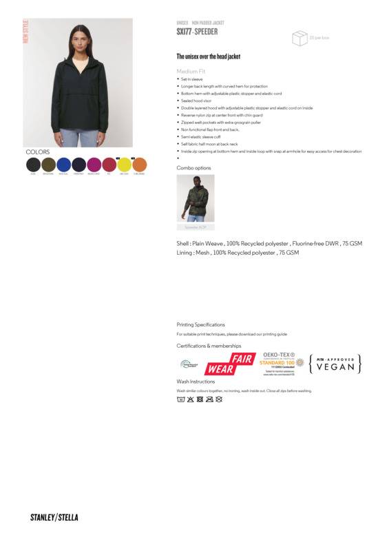 Over-the-head style that provides a sporty, street-style look for outdoor activities.Longer back length with curved hem for protectionBottom hem and hood with adjustable plastic stopper and elastic cordSealed hood visorZipped welt pocketsNon-functional flap, front and backSelf-fabric half-moon at back neckInside zip opening at bottom hem and inside loop, with snap at armhole providing easy access for chest decoration.Accreditations: Fair Wear Foundation|GRS|Oeko-Tex Standard 100|Peta Approved VeganAge Group: AdultFabric: Shell: 100% Recycled polyester plain wave. Lining: 100% Recycled polyester meshGender: UnisexPlus Size: YesProduct Type: HoodiesSize Range: XXS to 3XLSizing To Fit: XXS 32/34″ XS 34/36″ S 36/38″ M 38/40″ L 41/43″ XL 43/45″ 2XL 46/47″ 3XL 48/50″Tag: Tear-outWashing Instructions: Do not tumble dry. Wash at 30°C. Do not bleach. Do not iron.Weight (GSM): Outer and lining: 75gsm]]>