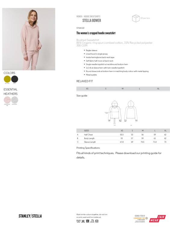 The on-trend boxy fit hoodie is crafted from premium 300gsm 85% organic cotton, 15% recycled polyester brushed fabric with a feminine bow tie at waist and has a soft-hand feel.Raglan sleeveLined hood in single JerseyInside herringbone back neck tapeSelf-fabric half-moon at back neckSingle needle top-stitch at neckline and bottom hem1x1 rib at sleeve hem with twin-needle top-stitchRound drawcords at bottom hem in matching body colour with metal tippingMetal eyelets.Accreditations: Fair Wear Foundation|Oeko-Tex Standard 100|Peta Approved VeganAge Group: AdultFabric: 85% Organic ringspun combed cotton, 15% Recycled polyesterGender: FemalePlus Size: NoProduct Type: HoodiesSize Range: XS to XLSizing To Fit: XS 8 S 10 M 12 L 14 XL 16Tag: Tear-outWashing Instructions: Washing: 30°. Bleaching no. Ironing 110°. Do not tumble dry. Do not dry clean.Weight (GSM): 300gsm]]>