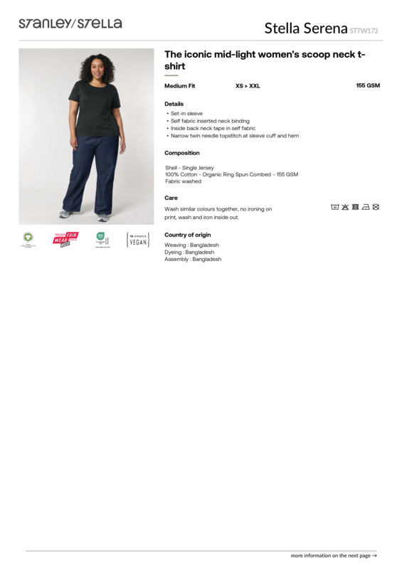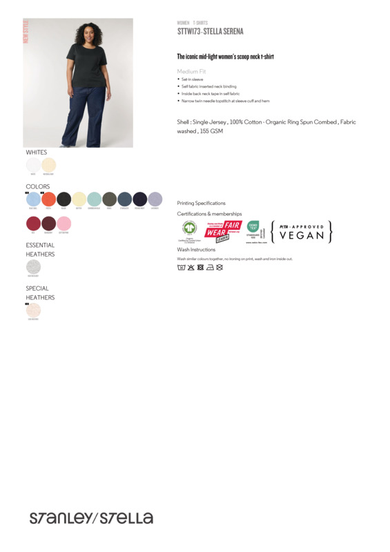 The women’s Stella Serena iconic mid-light t-shirt comes in a weight of 155gsm, with side seams and in a classic medium fit. Featuring a wide colour palette to choose from, its 100% organic ringspun combed cotton provides the perfect, smooth printing surface for decoration.The iconic women’s mid-light scoop neck t-shirtMedium fitSet-in sleeve1x1 rib at neck collarInside back neck tape in self-fabricNarrow twin-needle topstitch at sleeve cuff and hem.Accreditations: Fair Wear Foundation|Oeko-Tex Standard 100|Peta Approved VeganAge Group: AdultFabric: 100% Organic compact ringspun cotton single JerseyGender: FemalePlus Size: NoProduct Type: T-ShirtsSize Range: XS–2XLSizing To Fit: XS 8 S 10 M 12 L 14 XL 16 2XL 18Tag: Tear-outWashing Instructions: Machine wash, 30?C. Wash similar colours together. No ironing on print. Wash and iron inside out. Do not tumble dry.Weight (GSM): 155gsm]]>