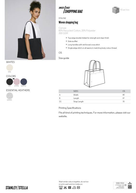 The woven shopping bag is cut in premium 300gsm 80% reclaimed cotton, 20% recycled polyester and features clean and reinforcing finishes.Top edge double folded for strength and clean finishSide souffletLong handles with reinforced cross stitchSingle edge stitch on all seams in matching body colour threadUnisex80% recycled cotton, 20% recycled polyesterCanvas.Accreditations: Fair Wear Foundation|GRS|Oeko-Tex Standard 100|Peta Approved VeganAge Group: AdultBag Dimensions: 49 x 37cmFabric: 80% Recycled cotton, 20% Recycled polyesterGender: UnisexPlus Size: NoProduct Type: BagsSize Range: OnesizeSizing To Fit: One sizeTag: Tear-outWashing Instructions: Wash at 30° Gentle. Bleaching no. Ironing: 110°. Do not tumble dry. Do not dry clean.Weight (GSM): 300gsm]]>