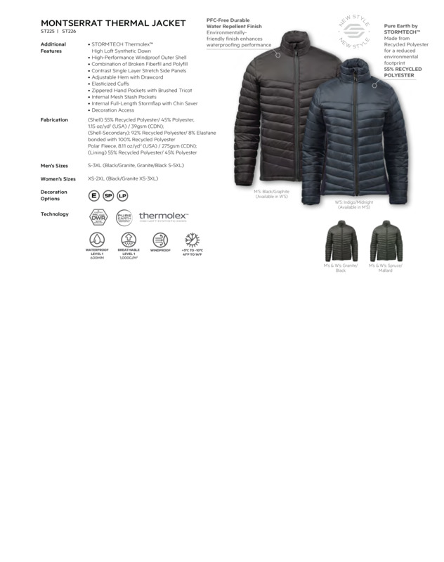 The Montserrat thermal jacket helps you to warm up in damp and cold environments with its lightweight quilted body and stretch side panels. A durable, PFC-free, water-repellent finish on the main body helps to repel water in damp conditions., while the chin saver and adjustable hem with drawcord can be adjusted for maximum comfort. This jacket is built with both virgin and recycled polyester fabric inputs for a reduced environmental footprint.Pure Earth by STORMTECH™STORMTECH Thermolex™ high loft synthetic downDurable, PFC-free, water-repellent finishHigh-performance, windproof outer shellCombination of broken fibre fill and polypillContrast single layer stretch side panelsAdjustable hem with drawcordElasticised cuffsZipped hand pockets with brushed tricotinternal mesh stash pocketsInternal full-length storm flap with chin saverDecoration accessWRAP certified.Accreditations: SEDEX|WRAP|RecycledAge Group: AdultFabric: Shell: 55% Recycled polyester, 45% Polyester, 1.15 oz/yd2 (USA) / 39gsm (CDN). Shell-secondary: 92% Recycled polyester, 8% Elastane bonded with 100% Recycled polyester polar fleece, 8.11 oz/yd2 (USA) / 275gsm (CDN). Lining: 55% Recycled polyester, 45% PolyesterGender: MalePlus Size: NoProduct Type: JacketsSize Range: S–2XLSizing To Fit: S 35/38″ M 38/41″ L 41/44″ XL 44/47″ 2XL 47/50″Tag: Tear-outWashing Instructions: Machine wash cold. Gentle cycle with like colours. Do not use softeners. Do not bleach. Tumble dry low temperature. Do not iron. Do not iron decoration. Do not dry clean.Weight (GSM): 39gsm ]]>