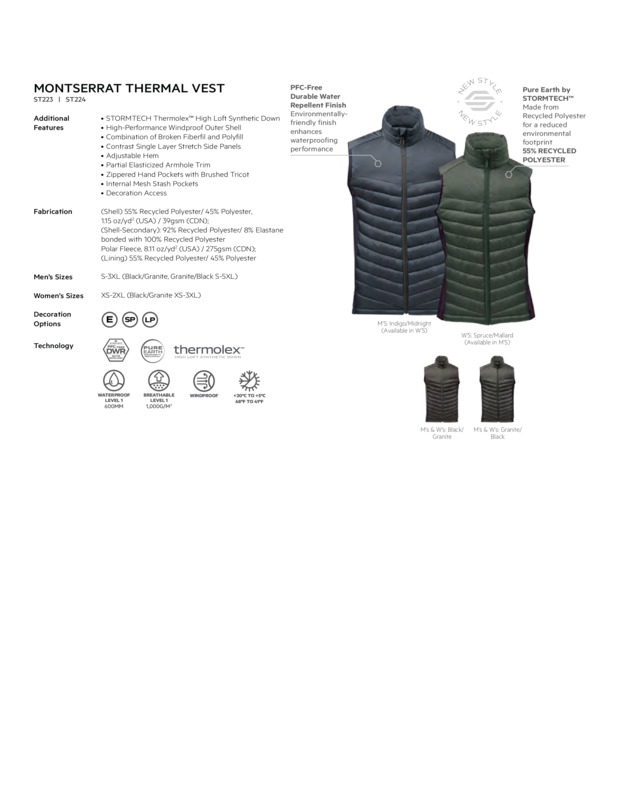 The women’s Montserrat vest helps you to warm up in damp and cold environments with its lightweight quilted body and stretch side panels. A durable, PFC-free, water-repellent finish on the main body helps to repel water in damp conditions, while the chin saver and adjustable hem with drawcord can be adjusted for maximum comfort. This vest is built with both regular and recycled polyester fabric inputs for a reduced environmental footprint.Pure Earth by STORMTECH™Durable, PFC-free, water-repellent finishCombination of broken fibre fill and polyfillAdjustable hemZipped hand pockets with brushed tricotDecoration accessSTORMTECH Thermolex™ high loft synthetic downHigh-performance windproof outer shellContrast single-layer stretch side panelsPartial elasticised armhole trimInternal mesh stash pocketsWRAP certified.Accreditations: SEDEX|WRAP|RecycledAge Group: AdultFabric: Shell: 55% Recycled polyester, 45% Polyester. 1.15 oz/yd2 (USA) / 39gsm (CDN). Shell-secondary: 92% Recycled polyester, 8% Elastane bonded with 100% Recycled polyester polar fleece, 8.11 oz/yd2 (USA) / 275gsm (CDN). Lining: 55% Recycled polyester, 45% PolyesterGender: FemalePlus Size: NoProduct Type: Gilets & Body WarmersSize Range: S–XLSizing To Fit: S 33.5/35.5″ M 35.5/38″ L 38/41″ XL 41/44.5Tag: Tear-outWashing Instructions: Machine wash cold. Gentle cycle with like colours. Do not use softeners. Do not bleach. Tumble dry low temperature. Do not iron. Do not iron decoration. Do not dry clean.Weight (GSM): 39gsm]]>