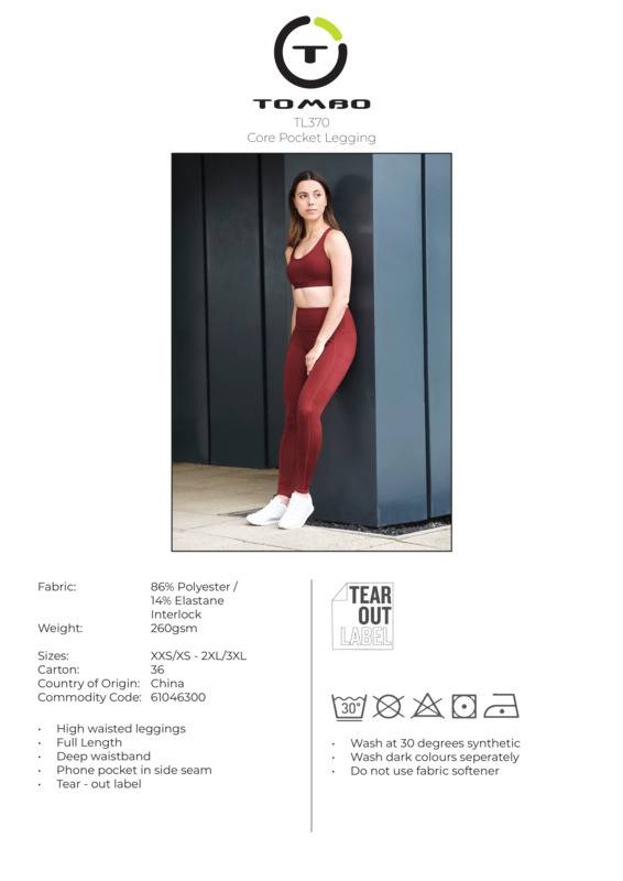 These all-new core leggings were built to push your performance in style, offering a high-waisted grip and functional side pocket to hold your phone or other belongings. The fabric is stretchable and easy to breathe with zero transparency and are 100% squat proof. Tear-out label for easy rebranding.Women's core leggings with high waist and deep waistbandPhone pocket in side panel on left sideTear-out labelBSCI certified.Accreditations: Amfori BSCIAge Group: AdultFabric: 86% Polyester, 14% ElastaneGender: FemalePlus Size: YesProduct Type: LeggingsSize Range: XXS to 3XLSizing To Fit: XXS/XS 6/8 S/M 10/12 L/XL 16/16 2XL/3XL 18/20Tag: Tear-outWashing Instructions: 30 Synthetic wash. Do not bleach. Do not dry clean. Tumble dry on low. Iron on low. Wash similar colours together. Do not use fabric softener.Weight (GSM): 260gsm]]>