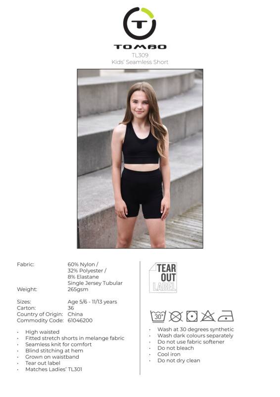 These high-stretch kids seamless shorts are the perfect option for any activity, allowing total wearer flexibility. The high waist and melange fabric help raise the stakes in both comfort and style.High-waisted, fitted stretch shorts in melange fabric (Dark Grey Marl)Seamless knit for comfortBlind stitching at hems and grown-on waistbandTombo tear-out labelBSCI certifiedOeko-Tex certifiedWRAP certified.Accreditations: Amfori BSCI|WRAP|Oeko-TexAge Group: KidsFabric: 60% Nylon, 32% Polyester, 8% Elastane. Black: 96% Nylon, 4% ElastaneGender: UnisexPlus Size: NoProduct Type: ShortsSize Range: 5/6 to 11/13Sizing To Fit: 5/6 22″ 7/8 23″ 9/10 24″ 11/13 26″Tag: Tear-outWashing Instructions: 30° synthetic wash. Do not bleach. Do not dry clean. Tumble dry on low. Iron on low. Wash similar colours together. Do not use fabric softener.Weight (GSM): 265gsm]]>