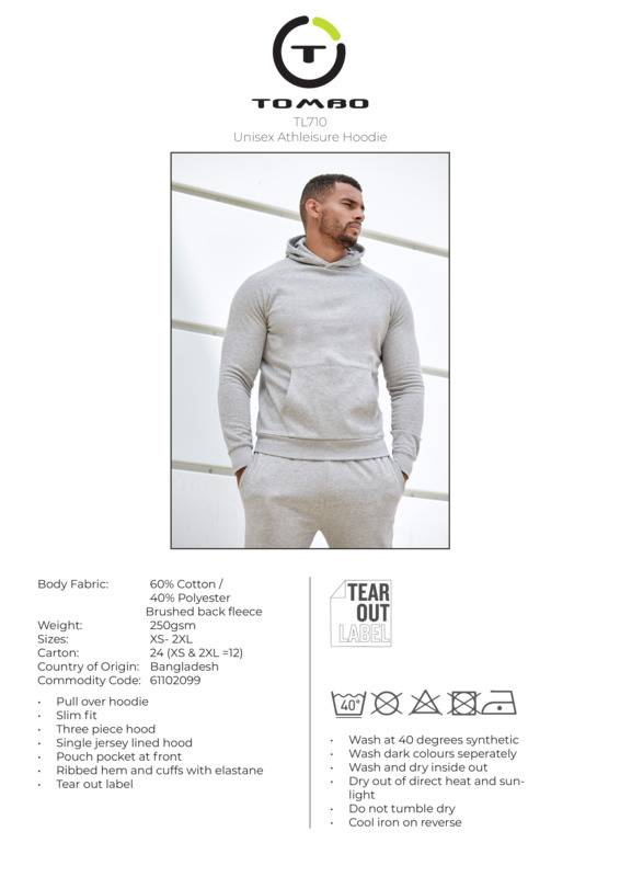 Keep it comfy in this on-trend unisex athleisure hoodie, featuring a longline slim-fit fora performance feel that also offers street style. Cut from an ultra-smooth brushed back fleece cotton-poly blend, this hoodie has an overhead hood, pouch pocket and ribbed trims for a custom fit. Finished with a tear-out label to make rebranding easy.Pull-over hoodieSlim fit3-piece hoodSingle Jersey-lined hoodPouch pocket at frontRibbed hem and cuffs with elastaneBSCI certifiedOeko-Tex certifiedSEDEX certified.Accreditations: Amfori BSCI|Oeko-Tex|SedexAge Group: AdultFabric: 60% Cotton, 40% PolyesterGender: UnisexPlus Size: NoProduct Type: HoodiesSize Range: XS to 2XLSizing To Fit: XS 34/36″ S 36/38″ M 38/40″ L 42″ XL 44/46″ 2XL 48″Tag: Tear-outWashing Instructions: Machine wash 40° synthetic. Do not bleach. 2 dot iron. Do not tumble dry. Dry clean with any solvent except Trichloroethylene. Iron on reverse. Wash dark colours separately. Wash and dry inside out. Dry out of direct sunlight.Weight (GSM): 250gsm]]>