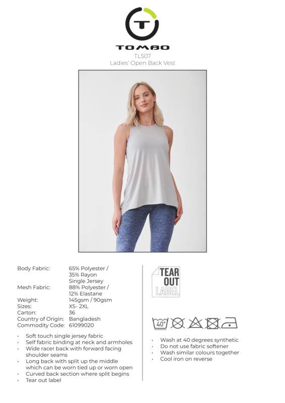 This women's open back vest mixes innovation and style to create the perfect garment for both working out and hanging out. The long back with split can be worn open or tied up for maximum versatility.Soft-touch single Jersey fabricSelf-fabric binding at neck and armholesWide racer back with forward facing shoulder seamsLong back with split up the middle, which can be worn open or tied upCurved back section where split beginsTombo tear-out labelBSCI certified.Accreditations: Amfori BSCIAge Group: AdultFabric: Body: 65% Polyester, 35% Rayon single Jersey. Mesh: 88% Polyester, 12% ElastaneGender: FemalePlus Size: NoProduct Type: VestsSize Range: XS to 2XLSizing To Fit: XS 30/32″ S 32/34″ M 34/36″ L 36/38″ XL 38/40″ 2XL 40/42″Tag: Tear-outWashing Instructions: Wash at 40 degrees synthetic wash. Do not use fabric softener. Wash similar colours together. Do not tumble dry. Do not bleach. Do not dry clean. Cool iron on reverse.Weight (GSM): Body: 140gsm. Mesh: 95gsm]]>