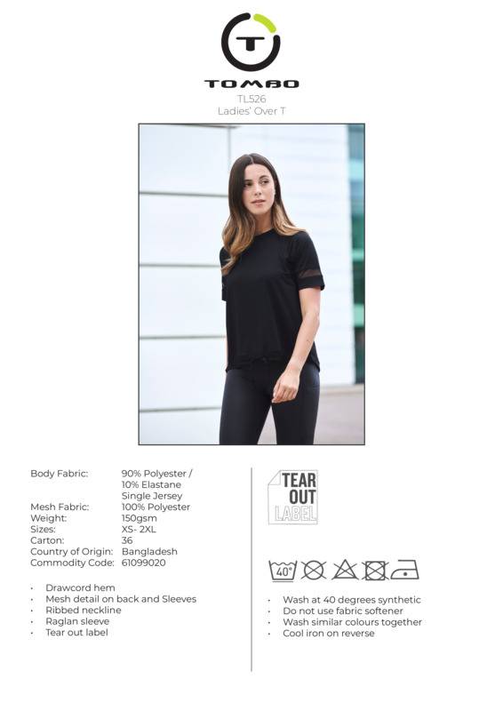 Mesh it up with our over T, for the ultimate on-trend layered look. Featuring mesh panels on the sleeves and back, plus a drawstring waistband for extra versatility.Oversize T, mesh back yoke and sleeve panels, draw cord hem with panel, lightweight soft hand feel fabric, tear-out labelBSCI certified.Accreditations: Amfori BSCIAge Group: AdultFabric: 90% Polyester, 10% Elastane. Mesh: 100% PolyesterGender: FemalePlus Size: NoProduct Type: T-ShirtsSize Range: XS to 2XLSizing To Fit: XS 30/32″ S 32/34″ M 34/36″ L 36/38″ XL 38/40″ 2XL 40/42″Tag: Tear-outWashing Instructions: Wash at 40 degrees. Wash as Synthetics. Do not dry clean. Do not bleach. Wash dark colours separately. Wash and dry inside out. Re-Shape while damp. Do not use fabric softener. Dry out of direct heat and sunlight. Do not tumble dry. Cool iron on reverse.Weight (GSM): 150gsm]]>