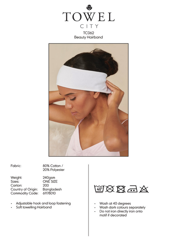 A luxury beauty essential, this style is made from the softest of fabrics with an adjustable hook and loop fastening. This soft cotton product is popular within a variety of luxury environments; from home to spa.Soft cotton rich headband with adjustable hook and loop fasteningSEDEX certifiedOeko-Tex certifiedBSCI certified.Accreditations: Amfori BSCI|Oeko-Tex|SedexAge Group: AdultFabric: 80% Cotton, 20% PolyesterGender: UnisexPlus Size: NoProduct Type: HeadbandsSize Range: OneSizeSizing To Fit: One size - adjustableTag: TaglessWashing Instructions: Do not bleach. Do not tumble dry. Do not dry clean. Wash at 40 degrees synthetic. Wash dark colours separately.Weight (GSM): 240gsm Terry]]>