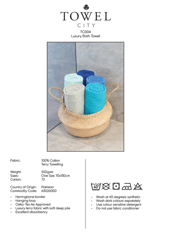 Luxury bath towel with soft, deep pile and excellent absorbency. Featuring a herringbone border with a convenient hanging loop. Available in an array of popular colours.Herringbone style border, hanging loopOeko-Tex certifiedBSCI certified.Accreditations: Amfori BSCI|Oeko-TexAge Group: Adult|KidsFabric: 100% Ringspun cottonGender: UnisexPlus Size: NoProduct Type: TowelsSize Range: OnesizeSizing To Fit: One size (70 x 130cm)Tag: TaglessWashing Instructions: Do not bleach. Tumble dry low. 2 dot iron. Do not dry clean. Wash at 40 degrees cotton. Wash dark colours separately. Use colour sensitive detergent. Use colour recommended detergent. Dry out of direct sunlight.Weight (GSM): 550gsm Thick pile]]>