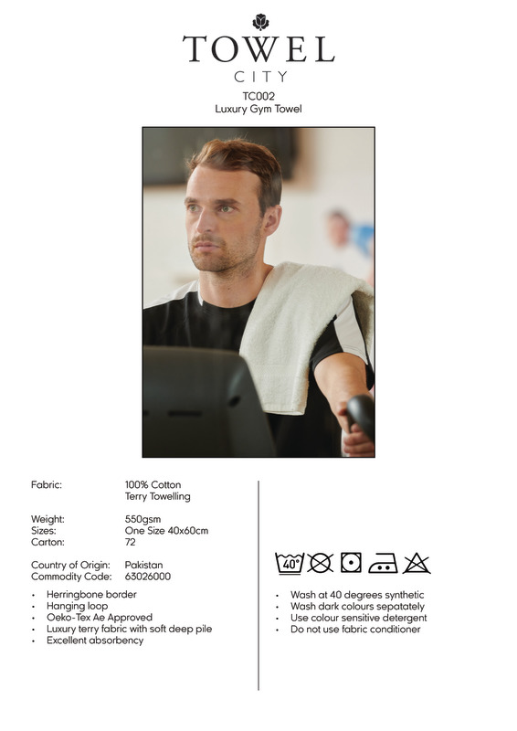 Luxury gym towel with soft, deep pile and excellent absorbency. Featuring a herringbone border with a convenient hanging loop. Available in popular colours.Herringbone style border, hanging loopOeko-Tex certifiedBSCI certified.Accreditations: Amfori BSCI|Oeko-TexAge Group: Adult|KidsFabric: 100% Ringspun cottonGender: UnisexPlus Size: NoProduct Type: TowelsSize Range: OnesizeSizing To Fit: One size (40 x 60cm)Tag: TaglessWashing Instructions: Do not bleach. Tumble dry low. 2 dot iron. Do not dry clean. Wash at 40 degrees cotton. Wash dark colours separately. Do not use fabric conditioner. Use colour sensitive detergent. Dry out of direct sunlight.Weight (GSM): 550gsm Thick pile]]>