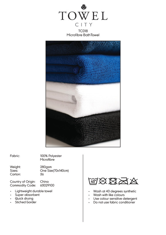The microfibre bath towel is both lightweight yet durable with soft pile and stitched border. Super absorbent and quick-drying, the towel is perfect for embroidery and sublimation printing.Durable, soft pileLightweightSuper absorbentQuick dryingStitched borderOeko-Tex certifiedSEDEX certifiedWRAP certified.Age Group: Adult|KidsFabric: 100% Polyester microfibreGender: UnisexPlus Size: NoProduct Type: TowelsSize Range: OnesizeSizing To Fit: One size (70 x 140cm)Tag: TaglessWashing Instructions: Wash at 40 degrees synthetic. Do not Bleach. Do not tumble dry. Do not use fabric conditioner. Wash with like colours. Do not iron. Do not use fabric softener. Use colour sensitive detergent. Wash with other non-lining articles or in lingerie wash bag.Weight (GSM): 280gsm]]>