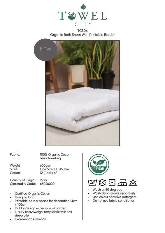 Towel City’s Organic Collection consists of luxury heavyweight terry towelling made from 100% organic cotton. With an extremely soft hand feel and highly absorbent fabric, this towel also has a large decoration space, plus a hanging loop for easy storage. Suitable all industries and events.Luxury, heavyweight, organic cotton bath sheet with 14cm border area for easy decorationDobby design, beautifully soft hand feel and highly absorbent, with hanging loopPackaged in biodegradable bagsAmfori BSCI certified.Accreditations: Amfori BSCIFabric: 100% Organic cotton, terry towellingGender: UnisexPlus Size: NoProduct Type: TowelsSize Range: One sizeSizing To Fit: One size (100 x 150cm)Tag: TaglessWashing Instructions: 40 degree wash. Do not bleach. Tumble dry on low. 2 dot iron. Do not dry clean. Do not use fabric softener. Wash with similar colours.Weight (GSM): 600gsm]]>