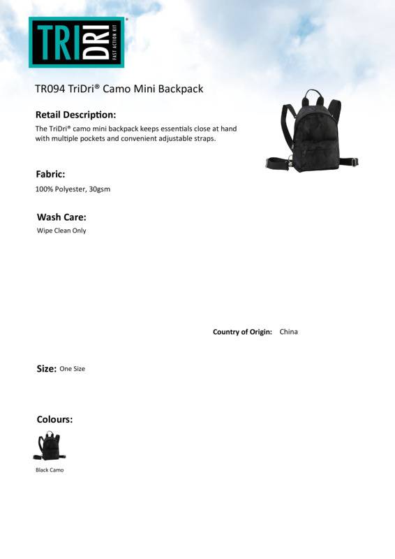 The TriDri® camo mini backpack keeps essentials close at hand with multiple pockets and convenient adjustable straps.Attractive printAdjustable arm strapsChrome strap loops, strap clasps and adjustersFront zip pocket and hidden zip fastening on the topWe recommend using block out vinyl and inks.Product contains no branded neck or waist labelRemovable Kimble or looped garment tagsInner seam label holds important product information on one label with a second label containing brand information which can be cut-away.Accreditations: Amfori BSCIAge Group: AdultFabric: 100% PolyesterGender: UnisexPlus Size: NoProduct Type: BagsSize Range: OnesizeSizing To Fit: One sizeTag: Cut-away inner labelWashing Instructions: Wipe clean onlyWeight (GSM): 30gsm]]>