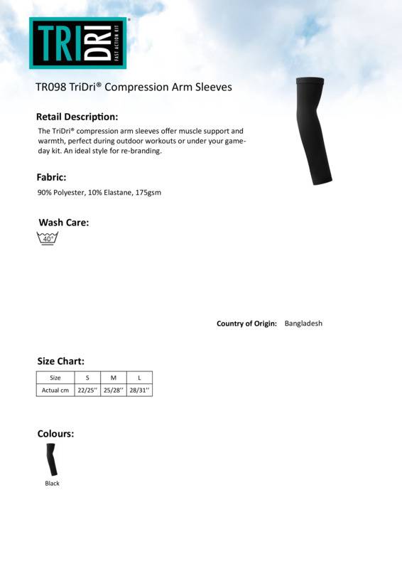 The TriDri® compression arm sleeves offer muscle support and warmth, perfect during outdoor workouts or under your game-day kit. An ideal style for re-branding.Protective compression arm sleevesElasticated trim around the topStyled to fit the shape of the armWe recommend using block out vinyl and inks.Product contains no branded neck or waist labelRemovable Kimble or looped garment tagsInner seam label holds important product information on one label with a second label containing brand information which can be cut-away.Accreditations: Amfori BSCIAge Group: AdultFabric: 90% Polyester, 10% ElastaneGender: UnisexPlus Size: NoProduct Type: Arm GuardsSize Range: S to LSizing To Fit: S 22/25″ M 25/28″ L 28/31″Tag: Cut-away inner labelWashing Instructions: Wash at 40 degree.Weight (GSM): 175gsm]]>