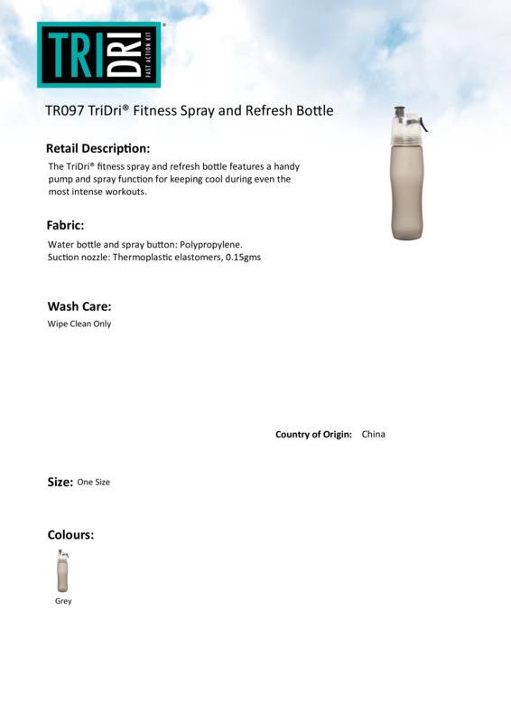 The TriDri® fitness spray and refresh bottle features a handy pump and spray function for keeping cool during even the most intense workouts.Pump and spray function bottleFitted sports capScrew lidD:6.2/7cmH:28cmWe recommend using block out vinyl and inks.Product contains no branded neck or waist labelRemovable Kimble or looped garment tagsInner seam label holds important product information on one label with a second label containing brand information which can be cut-away.Accreditations: Amfori BSCIAge Group: Adult|KidsFabric: Water bottle and spray button: Polypropylene. Suction nozzle: Thermoplastic elastomersGender: UnisexPlus Size: NoProduct Type: BottlesSize Range: OnesizeSizing To Fit: One sizeTag: Cut-away inner labelWashing Instructions: Wipe Clean OnlyWeight (GSM): 0.15gsm]]>