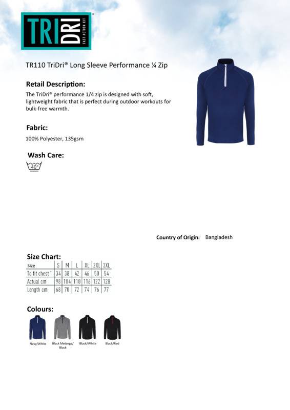 The TriDri® performance 1/4 zip is designed with soft, lightweight fabric that is perfect during outdoor workouts for bulk-free warmth.Contrast ¼ zipLong sleevesStretchTwin-needle stitchingWicking fabricWe recommend using block out vinyl and inks.Product contains no branded neck or waist labelRemovable Kimble or looped garment tagsInner seam label holds important product information on one label with a second label containing brand information which can be cut-away.Accreditations: Amfori BSCIAge Group: AdultFabric: 100% PolyesterGender: MalePlus Size: YesProduct Type: Sports OvertopsSize Range: S to 3XLSizing To Fit: S 34″ M 38″ L 42″ XL 46″ 2XL 49″ 3XL 52″Tag: Cut-away inner labelWashing Instructions: 40c Domestic WashWeight (GSM): 135gsm]]>