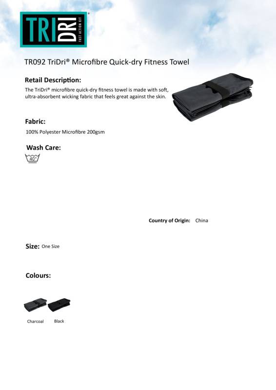 The TriDri® microfibre quick-dry fitness towel is made with soft, ultra-absorbent wicking fabric that feels great against the skin.Wicking fabricSupersoft towelLightweightMachine washableQuick-dryingCompact measuring 90cm x 40cmWe recommend using block out vinyl and inks.Product contains no branded neck or waist labelRemovable Kimble or looped garment tagsInner seam label holds important product information on one label with a second label containing brand information which can be cut-away.Accreditations: SEDEXAge Group: AdultBag Dimensions: 90 x 40cmFabric: 89% Polyester 11% Nylon microfiberGender: UnisexPlus Size: NoProduct Type: TowelsSize Range: OnesizeSizing To Fit: One sizeTag: Cut-away inner labelWashing Instructions: Domestic wash at 40cWeight (GSM): 200gsm]]>