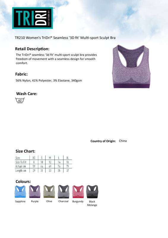 The TriDri® seamless '3d fit' multi-sport sculpt bra provides freedom of movement with a seamless design for smooth comfort.Seamless sports braContrast grown on waistbandWicking fabricBody sculpting design detailingMedium impactWe recommend using block out vinyl and inks.Product contains no branded neck or waist labelRemovable Kimble or looped garment tagsInner seam label holds important product information on one label with a second label containing brand information which can be cut-away.Accreditations: Amfori BSCIAge Group: AdultFabric: 56% Nylon, 41% Polyester, 3% Elastane. Black Melange: 70% Nylon, 25% Polyester, 5% ElastaneGender: FemalePlus Size: NoProduct Type: BrasSize Range: XS to XLSizing To Fit: XS 8 S 10 M 12 L 14 XL 16Tag: Cut-away inner labelWashing Instructions: 40c Domestic WashWeight (GSM): 340gsm]]>