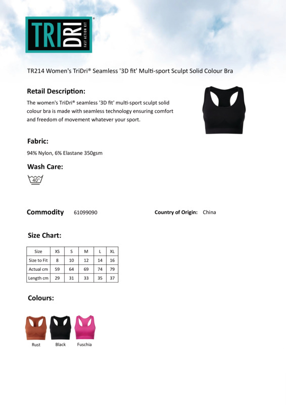 The TriDri® seamless '3D fit' multi-sport sculpt solid colour bra is made with seamless technology ensuring comfort and freedom of movement whatever your sport.Seamless sports braGrown-on waistbandBody sculpting design detailingMedium impactWe recommend using block out vinyl and inks.Product contains no branded neck or waist labelRemovable Kimble or looped garment tagsInner seam label holds important product information on one label with a second label containing brand information which can be cut-away.Accreditations: Amfori BSCIAge Group: AdultFabric: 90% Nylon, 10% ElastaneGender: FemalePlus Size: NoProduct Type: BrasSize Range: XS to XLSizing To Fit: XS 8 S 10 M 12 L 14 XL 16Tag: Cut-away inner labelWashing Instructions: Domestic wash at 40cWeight (GSM): 350gsm]]>