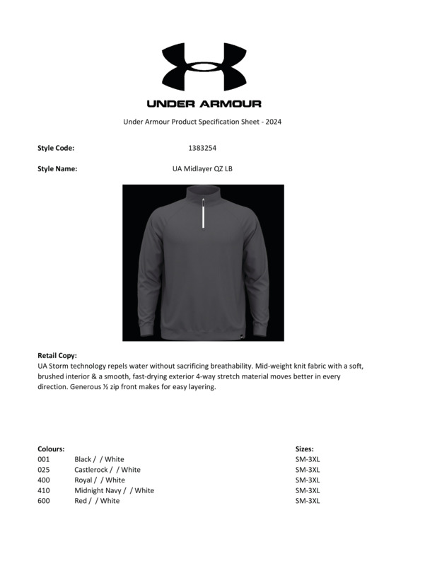 The UA midlayer QZ LB’s storm technology repels water without sacrificing breathability. Its midweight knit fabric – with soft, brushed interior and smooth, quick-drying, exterior, four-way stretch material – moves better in every direction, while a generous half-zip front makes for easy layering.This golf top provies extra warmth without packing on weight or bulkHow? We use hollow fibres that trap heat, but with less weight than solid fibresRain also rolls right off, so you can wear it in any weather.Age Group: AdultFabric: 88% Polyester, 12% ElastaneGender: MalePlus Size: YesProduct Type: FleeceSize Range: S–3XLSizing To Fit: S 34/36″ M 38/40″ L 42/44″ XL 46/48″ 2XL 50/52″ 3XL 52/54″Tag: Sewn TagWashing Instructions: Machine wash cold with similar colours. Do not use softeners. Use only non-chlorine bleach when needed. Tumble dry low. Do not iron. Do not dry clean.Weight (GSM): 230gsm]]>