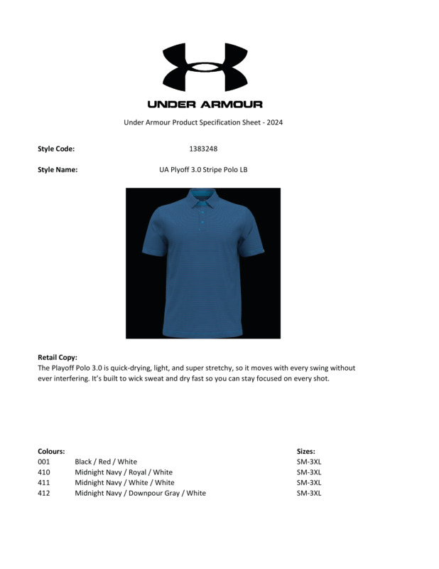 The UA playoff 3.0 stripe polo LB is quick-drying, light and super stretchy, so it moves with every swing without ever interfering. It’s built to wick sweat and dry fast, so you can stay focused on every shot.We took our most popular golf polo and made it even betterBuilt to be more breathable, extra-stretchy and to have a better fit, this polo helps you play, distraction-free, for all 18.Age Group: AdultFabric: 95% Polyester, 5% ElastaneGender: MalePlus Size: YesProduct Type: PolosSize Range: S–3XLSizing To Fit: S 34/36″ M 38/40″ L 42/44″ XL 46/48″ 2XL 50/52″ 3XL 52/54″Tag: Sewn TagWashing Instructions: Machine wash cold with similar colours. Do not use softeners. Use only non-chlorine bleach when needed. Tumble dry low. Do not iron. Do not dry clean.Weight (GSM): 185gsm]]>