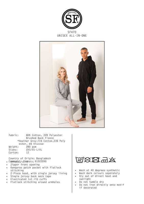 Loungewear, but make it fashionable. A cool slim fit all-in-one with front zip opening. Cosy casual wear for after class. Features tear-out label for easy rebranding.Unisex styling all-in-one, matches Kids SM470Slim fitZipper front openingElasticated 1x1 rib cuffs2-piece hood, with single Jersey liningKangaroo patch pocket with flatlock stitchingFlatlock stitching around armholesTaped back neckTear-out labelBSCI certifiedVegan certified.Accreditations: Amfori BSCI|Peta Approved VeganAge Group: AdultFabric: 80% Cotton, 20% Polyester brushed back fleece. Heather Grey: 85% Cotton, 15% ViscoseGender: UnisexPlus Size: NoProduct Type: OnesiesSize Range: XXS/XS to L/XLSizing To Fit: XXS/XS 32/36″ S/M 36/40″ L/XL 42/46″Tag: Tear-outWashing Instructions: Do not bleach. Do not tumble dry. 2 dot iron. Do not dry clean. Wash at 40 degrees synthetic. Wash dark colours separately. Do not iron directly onto motif if decorated. Keep away from fire. Dry out of direct heat and sunlight.Weight (GSM): 280gsm]]>