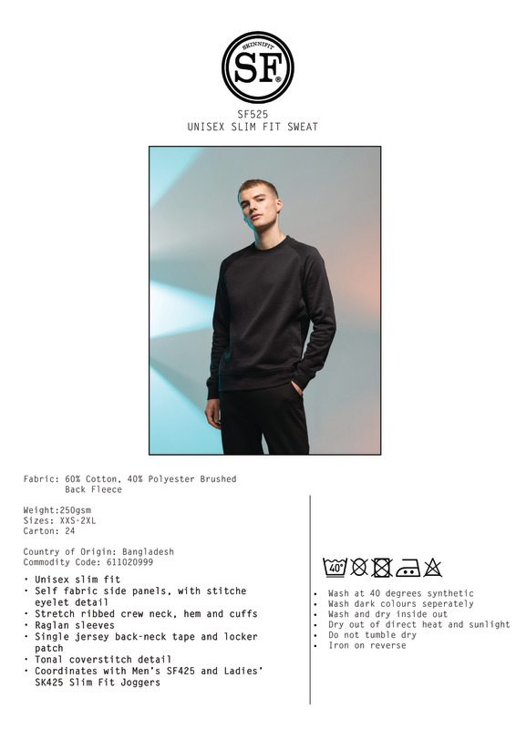 On-trend slim fit sweatshirt perfect for displaying a cool design, logo or slogan and making it your own. Stretch ribbed crew neck, hem and cuffs, self-fabric side panels, with stitched eyelet detail.Tear-out labelSide panels, with eyelet detailMatches SF425/SK425 Slim fit jogger ribbed neckline, hem and cuffsRaglans sleevesTonal cover-stitch detailSEDEX certifiedOeko-Tex certifiedBSCI certifiedVegan certified.Accreditations: Amfori BSCI|Oeko-Tex|Sedex|Peta Approved VeganAge Group: AdultFabric: 60% Cotton, 40% Polyester brushed back fleeceGender: UnisexPlus Size: NoProduct Type: SweatshirtsSize Range: XXS to 2XLSizing To Fit: XXS 32/34″ XS 34/36″ S 36/38″ M 38/40″ L 42″ XL 44/46″ 2XL 48″Tag: Tear-outWashing Instructions: Do not bleach. 2 Dot iron. Do not dry clean. Wash at 40 degrees synthetic. Wash dark colours separately. Do not tumble dry. Iron on reverse. Dry out of direct heat and sunlight.Weight (GSM): 250gsm]]>