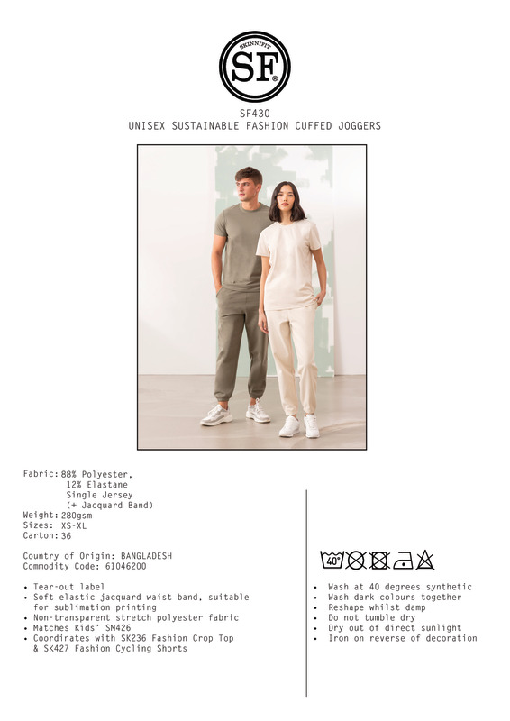 Step up your loungewear game. Unisex joggers, made from a mixture of regenerated cotton and recycled polyester. The sustainable generation is here. Tear-out label for easy rebranding and co-ordinates with SF Sustainable fashion range.Unisex regular-fit joggersElasticated waist and cuffs with round cord drawcordCurved front side pocketsBack patch pocketTonal topstitching detailCo-ordinates with SF Sustainable fashion rangeBrand-free, for easy rebrandingResealable, recyclable bags; made from 100% recycled plasticBSCI certifiedOeko-Tex certifiedSEDEX certifiedVegan certified.Accreditations: Amfori BSCI|Oeko-Tex|Sedex|Peta Approved VeganAge Group: AdultFabric: 60% Regenerated cotton, 40% Recycled polyesterGender: UnisexPlus Size: YesProduct Type: SweatpantsSize Range: XXS to 3XLSizing To Fit: XXS 28″ XS 30″ S 32″ M 34″ L 36″ XL 38″ 2XL 40″ 3XL 42″Tag: TaglessWashing Instructions: Machine wash 30° synthetics. Do not bleach. Iron low. Do not tumble dry. Dry clean with any solvent except Trichloroethylene. Iron on reverse. Wash dark colours separately. Dry out of direct sunlight.Weight (GSM): 260gsm]]>
