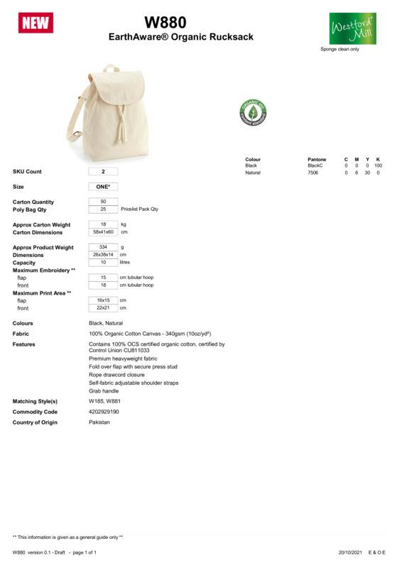 Made from 100% OCS-certified, organic cotton canvas, the WM880 is robust, reliable and kinder to the planet thanks to the premium, heavyweight fabric. The epitome of soft, unstructured style, the WM880 features a rope drawcord closure and fold over flap with press stud fastening, for added peace of mind. Adjustable, fabric shoulder straps provide optimum comfort, while a useful grab handle makes the WM880 super easy to pick up by hand. Also available is the WM881 Mini Rucksack.Contains 100% OCS-certified organic cotton, certified by Control Union CU811033Premium, heavyweight fabricFold-over flap with secure press studRope drawcord closureSelf-fabric adjustable shoulder strapsGrab handle.Accreditations: Organic 1 Content StandardAge Group: AdultBag Capacity: 10 LitresBag Dimensions: 26 x 38 x 14cmEmbroidery Information: Flap 15cm Tubular hoop. Front 18cm Tubular hoopFabric: 100% Organic cotton canvas 340gsm (10oz/yd²)Gender: UnisexPlus Size: NoPrint Area: Flap 16 x 15cm. Front 22 x 21cmProduct Type: BagsSize Range: One sizeSizing To Fit: One sizeTag: Sewn TagWeight (GSM): 334g]]>