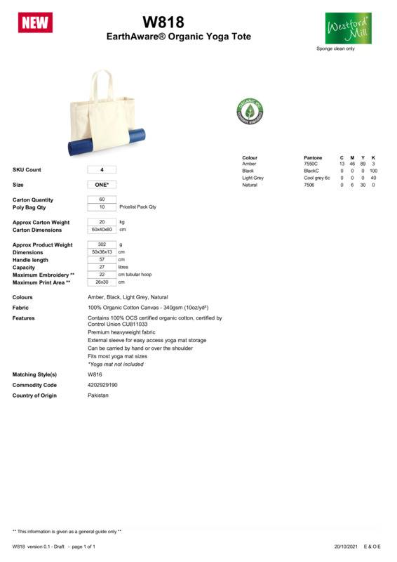 Modern-day living calls for multifunctional design. Spacious, durable and with its external, easy-access yoga mat sleeve, the WM818 is ideal for carrying all of your yoga essentials. As part of the EarthAware® collection, made from 100% organic, OCS-certified cotton canvas, its 57cm handle length means this eco-conscious bag can be carried by hand or over the shoulder, allowing you to focus on just your flow. (Yoga mat not included.)Contains 100% OCS-certified organic cotton, certified by Control Union CU811033Premium, heavyweight fabricExternal sleeve for easy-access yoga mat storageCan be carried by hand or over the shoulderFits most yoga mat sizes*Yoga mat not included.Accreditations: Organic 1 Content StandardAge Group: AdultBag Capacity: 27 LitresBag Dimensions: 50 x 36 x 13cmEmbroidery Information: 22cm Tubular hoopFabric: 100% Organic cotton canvas 340gsm (10oz/yd²)Gender: UnisexPlus Size: NoPrint Area: 26 x 30cmProduct Type: BagsSize Range: One sizeSizing To Fit: One sizeTag: Sewn TagWeight (GSM): 302g]]>
