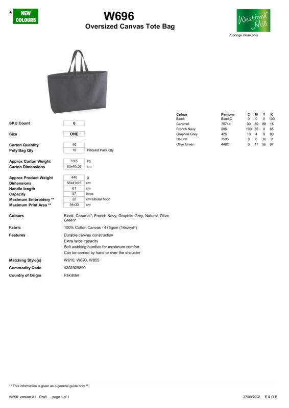 Taking a classic tote bag and supersizing it creates this modern, oversized design with its signature extra large capacity - the perfect bag for day trips, commute essentials or shopping on the go. The WM696 is available in a choice of core colourways, each made from a durable heavyweight 100% cotton canvas. Soft webbing handles provide maximum comfort whether worn over the shoulder or carried by hand.Durable, canvas constructionExtra-large capacitySoft webbing handles for maximum comfortCan be carried by hand or over the shoulderSEDEX certifiedReach certified.Accreditations: Sedex|ReachAge Group: AdultBag Capacity: 37 LitresBag Dimensions: 56 x 41 x 16cmEmbroidery Information: 22cm Tubular hoopFabric: 100% cotton canvas 475gsm (14oz/yd²)Gender: UnisexPlus Size: NoPrint Area: 54 x 33cmProduct Type: BagsSize Range: One sizeSizing To Fit: One sizeTag: Sewn TagWeight (GSM): 451g]]>