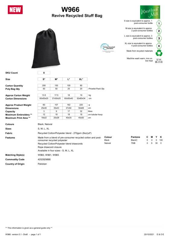 This versatile cotton stuff bag comes in a choice of four different sizes and two versatile colourways. Each features a classic drawcord closure for simple but effective storage. Made from a blend of GRS certified pre-consumer recycled cotton and post-consumer recycled polyester, this is a stuff bag that also carries us towards a more sustainable future.Made from a blend of pre-consumer recycled cotton and post-consumer recycled polyesterRecycled cotton/polyester-blend drawcordsRope drawcord closure.Accreditations: Global Recycled StandardAge Group: AdultBag Capacity: S - 3 Litres, M - 9 Litres, L - 17 Litres, XL - 32 LitresBag Dimensions: S - 25 x 30cm, M - 35 x 43cm, L - 47 x 54cm, XL - 50 x 68cmEmbroidery Information: S - 12cm, M - 18cm, L - 18cm, XL -18 cm Tubular hoopFabric: Recycled Cotton/Polyester blend 270gsm (8oz/yd²)Gender: UnisexPlus Size: NoPrint Area: S - 18 x 22cm, M - 25 x 28cm, L - 40 x 35cm, XL - 45 x 50cmProduct Type: BagsSize Range: S to XLSizing To Fit: S 25x30cm M 35x43cm L 47x54cm XL 50x68cmTag: Sewn TagWeight (GSM): S 60g, M 107g, L 162g, XL 220g]]>