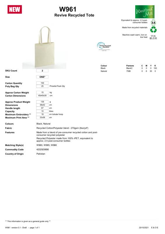 Made from a blend of GRS certified pre-consumer recycled cotton and post-consumer recycled polyester, the WM961 is a timeless style, perfect for everyday use in an eco-conscious future.Made from a blend of pre-consumer recycled cotton and post-consumer recycled polyesterRecycled polyester made from 100% rPET, equivalent to approximately 2.5 post-consumer bottles.Accreditations: Global Recycled StandardAge Group: AdultBag Capacity: 10 LitresBag Dimensions: 38 x 42cmEmbroidery Information: 18cm Tubular hoopFabric: Recycled Cotton/Polyester blend 270gsm (8oz/yd²)Gender: UnisexPlus Size: NoPrint Area: 33 x 36cmProduct Type: BagsSize Range: One sizeSizing To Fit: One sizeTag: Sewn TagWeight (GSM): 135g]]>