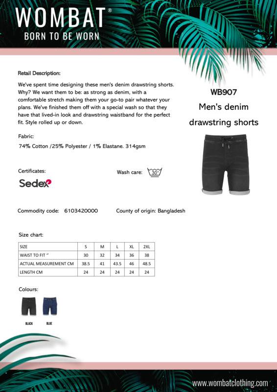 These men’s denim drawstring shorts have a comfortable stretch, making them your go-to pair, whatever your plans. They’re finished with a special wash, for that lived-in look, and have a drawstring waistband for the perfect fit. Stylish, rolled up or down.Two swing pockets and two back patch pockets with gunmetal cap detailingElasticated waistband with drawstringsGunmetal eyelets and caps to drawstringsStitched fly detailingWorn denim effectContrast stitchingShorts can be worn rolled upProduct contains no branded neck label.* Removable Kimble or looped garment tagsInner seam label holds important product information on one label with a second label containing brand information which can be cut-away.*Please note old stock may contain a fixed branded label.Accreditations: SEDEX|Amfori BSCIAge Group: AdultFabric: 74% Cotton, 25% Polyester, 1% ElastaneGender: MalePlus Size: NoProduct Type: ShortsSize Range: S – 2XLSizing To Fit: S 32″ M 34″ L 36″ XL 38″ 2XL 40″Tag: Cut-away inner labelWashing Instructions: Machine wash 30°C. Line dry. Wash with similar colours. Do not bleach. Cool Iron. Do not tumble dry. Do not dry clean. Wash inside out. Wash dark colours separately.Weight (GSM): 314gsm]]>