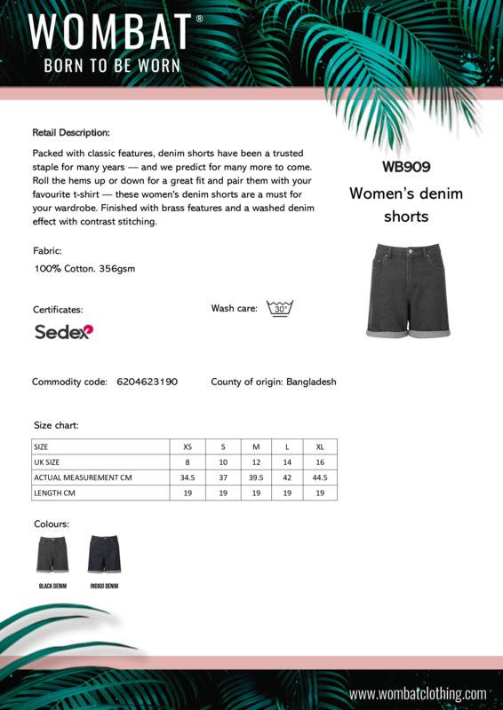 Packed with classic features, denim shorts have been a trusted staple for many years – and these women’s denim shorts are a must for your wardrobe. Roll the hems up or down for a great fit, then pair them with your favourite t-shirt. Finished with brass features and a washed denim effect with contrast stitching.Two front pockets with coin pocketBrass button and cap detailingTwo back patch pocketsZip fly and button fasteningWashed denim effectContrast stitchingBelt loopsShorts can be worn rolled upProduct contains no branded neck label.* Removable Kimble or looped garment tagsInner seam label holds important product information on one label with a second label containing brand information which can be cut-away.*Please note old stock may contain a fixed branded label.Accreditations: SEDEX|Amfori BSCIAge Group: AdultFabric: 100% CottonGender: FemalePlus Size: NoProduct Type: ShortsSize Range: XS – XLSizing To Fit: XS 8 S 10 M 12 L 14 XL 16Tag: Cut-away inner labelWashing Instructions: Machine wash 30°C. Line dry. Wash with similar colours. Do not bleach. Medium iron. Do not tumble dry. Do not dry clean. Wash inside out.Weight (GSM): 356gsm]]>