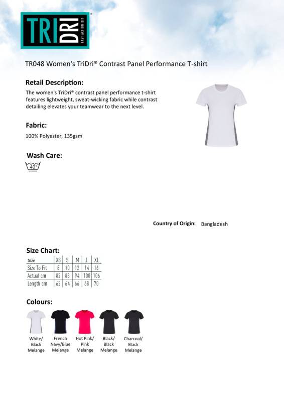 The women's TriDri® contrast panel performance t-shirt features lightweight, sweat-wicking fabric while contrast detailing elevates your teamwear to the next level.Wicking fabricContrast side panels in melange fabricStretchCrew neckShort sleeveLightweightTwin-needle stitching on hem and armsWe recommend using block out vinyl and inks.Product contains no branded neck or waist labelRemovable Kimble or looped garment tagsInner seam label holds important product information on one label with a second label containing brand information which can be cut-away.Accreditations: Amfori BSCIAge Group: AdultFabric: 100% PolyesterGender: FemalePlus Size: NoProduct Type: T-ShirtsSize Range: XS to XLSizing To Fit: XS 8 S 10 M 12 L 14 XL 16Tag: Cut-away inner labelWashing Instructions: 40c Domestic WashWeight (GSM): 135gsm]]>