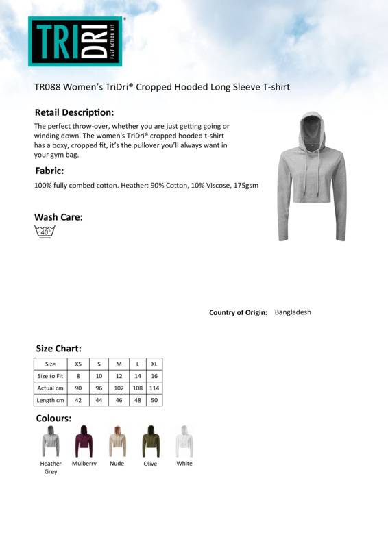The perfect throw-over, whether you are just getting going or winding down. The women's TriDri® cropped hooded t-shirt has a boxy, cropped fit, it’s the pull-over you’ll always want in your gym bag.Cropped hooded t-shirtLong sleeveDrawcords dyed to match with gunmetal eyelets and drawcord capsDouble layer hoodSoft-feelWe recommend using block out vinyl and inks.Product contains no branded neck or waist labelRemovable Kimble or looped garment tagsInner seam label holds important product information on one label with a second label containing brand information which can be cut-away.Accreditations: SEDEX|Amfori BSCIAge Group: AdultFabric: 100% fully combed cotton. Heather: 90% Cotton 10% ViscoseGender: FemalePlus Size: NoProduct Type: T-ShirtsSize Range: XS to XLSizing To Fit: XS 8 S 10 M 12 L 14 XL 16Tag: Cut-away inner labelWashing Instructions: Wash at 40 degrees. Line dry. Do not bleach. Do not iron. Do not tumble dry. Do not dry clean. Wash with similar colours.Weight (GSM): 175gsm]]>