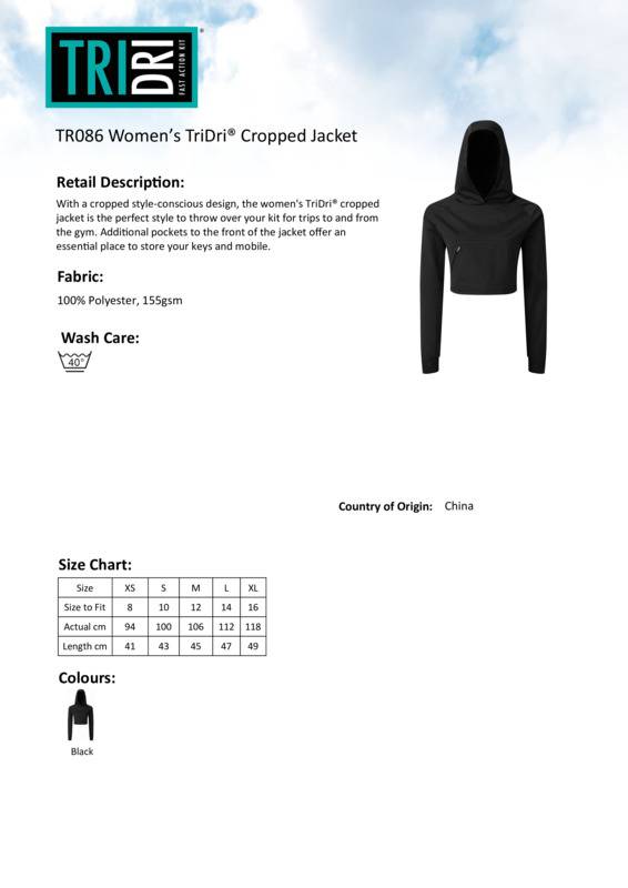 With a cropped style-conscious design, the women's TriDri® cropped jacket is the perfect style to throw over your kit for trips to and from the gym. Additional pockets to the front of the jacket offer an essential place to store your keys and mobile.Lightweight cropped pull-over jacketKangaroo pocket to front with additional zip detailing for storing items like keys etcSuper-smooth finish to jacketCuffs half elasticated for additional detailing and trapping in warmthDetailing to hoodWe recommend using block out vinyl and inks.Product contains no branded neck or waist labelRemovable Kimble or looped garment tagsInner seam label holds important product information on one label with a second label containing brand information which can be cut-away.Accreditations: Amfori BSCIAge Group: AdultFabric: 100% PolyesterGender: FemalePlus Size: NoProduct Type: JacketsSize Range: XS to XLSizing To Fit: XS 8 S 10 M 12 L 14 XL 16Tag: Cut-away inner labelWashing Instructions: Wash at 40 degrees. Line dry. Do not bleach. Do not iron. Do not tumble dry. Do not dry clean. Wash with similar colours.Weight (GSM): 155gsm]]>