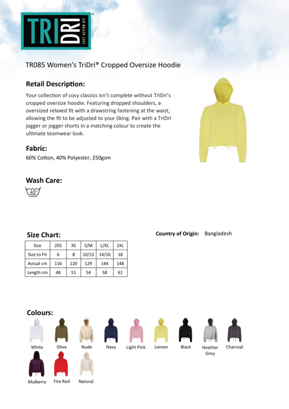 Your collection of cosy classics isn’t complete without TriDri’s cropped oversized hoodie. It features dropped shoulders, and an oversized relaxed fit with a drawstring fastening at the waist, allowing the fit to be adjusted to your liking. Pair with a TriDri jogger or jogger shorts in a matching colour to create the ultimate teamwear look.OversizedHooded sweatshirtDrawcord fastening at waistWe recommend using block out vinyl and inks.Product contains no branded neck or waist labelRemovable Kimble or looped garment tagsInner seam label holds important product information on one label with a second label containing brand information which can be cut-away.Accreditations: SEDEX|WRAP|Amfori BSCI|RCS Blended (Licence)Age Group: AdultFabric: 60% Cotton, 40% Recycled Polyester. Heather Grey: 90% Cotton, 10% ViscoseGender: FemalePlus Size: NoProduct Type: HoodiesSize Range: XXS to 2XLSizing To Fit: XXS 6 XS 8 S/M 10/12 L/XL 14/16 2XL 18Tag: Cut-away inner labelWashing Instructions: 40c Domestic WashWeight (GSM): 280gsm]]>