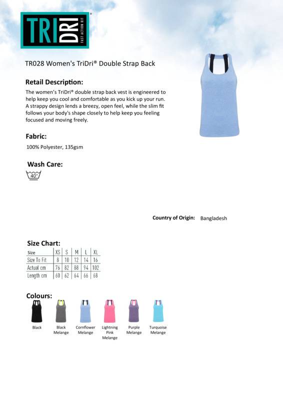 The women's TriDri® double strap back vest is engineered to help keep you cool and comfortable as you kick up your run. A strappy design lends a breezy, open feel, while the slim fit follows your body's shape closely to help keep you feeling focused and moving freely.Soft touch fabricContrast double strap on backOpen backSlight hi-lo hemTwin needle stitch on hem, neck and arm holesSlight stretchWe recommend using block out vinyl and inks.Product contains no branded neck or waist labelRemovable Kimble or looped garment tagsInner seam label holds important product information on one label with a second label containing brand information which can be cut-away.Accreditations: Amfori BSCIAge Group: AdultFabric: 100% PolyesterGender: FemalePlus Size: NoProduct Type: VestsSize Range: XS to XLSizing To Fit: XS 8 S 10 M 12 L 14 XL 16Tag: Cut-away inner labelWashing Instructions: Domestic wash at 40cWeight (GSM): 135gsm]]>